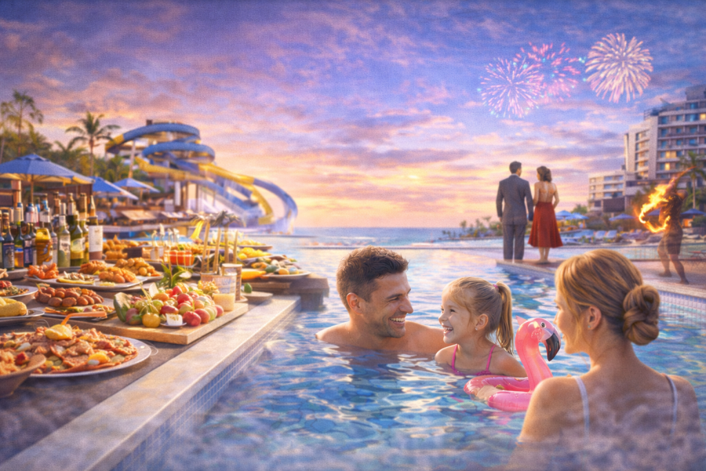 Çocuk kulüpleri, aquaparklar, animasyonlar ve gün boyu yiyecek seçenekleri sayesinde aileler rahat bir tatil geçirir.